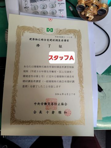 別件ですが、アスベスト調査士の資格を